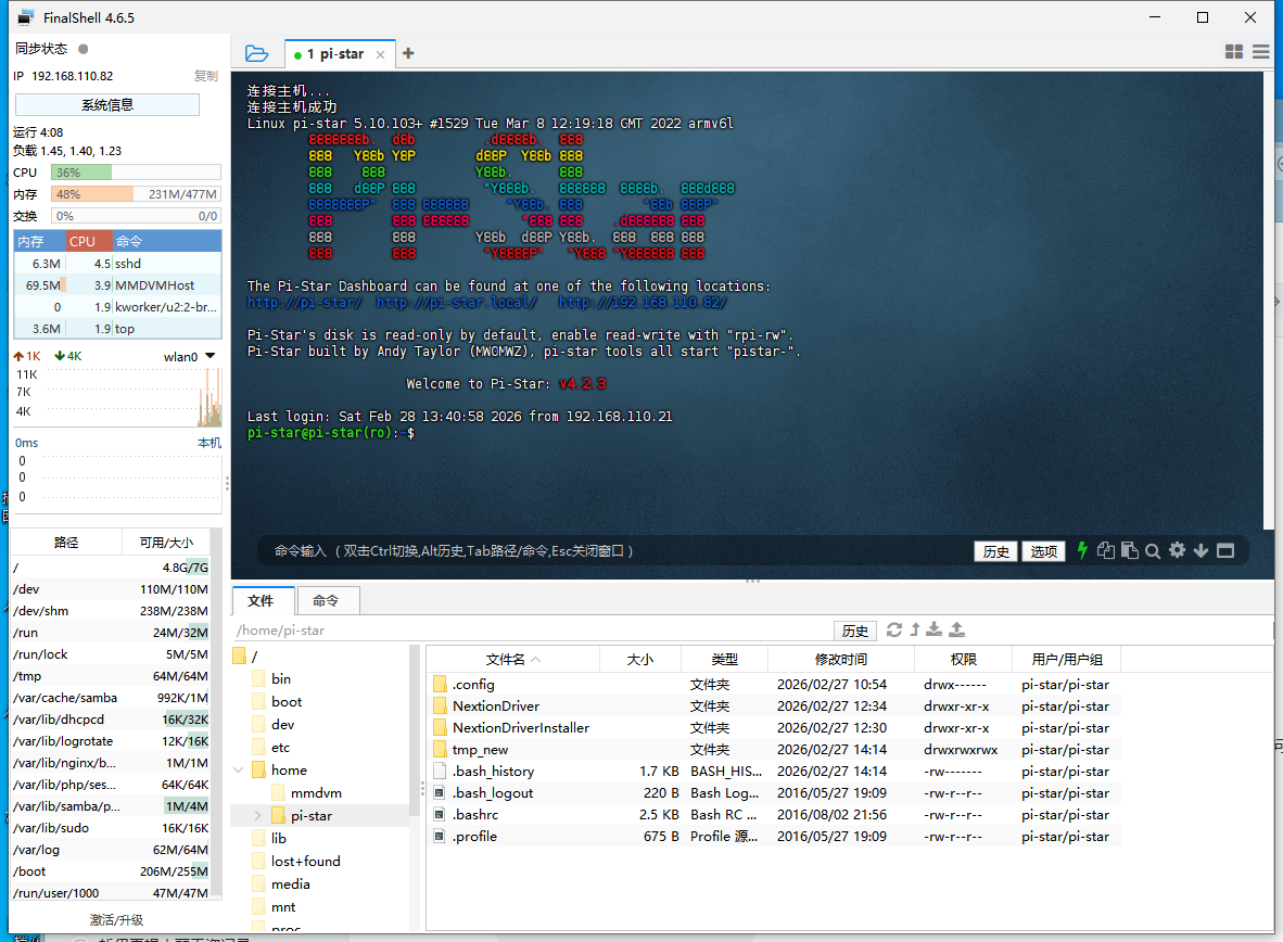 使用工具登录Pi-Star SSH,我使用的是 FinalShell,因为可以管理文件,方便上传驱动文件进去。